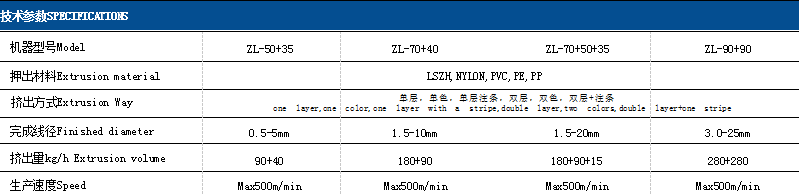 适合PVC, 低烟无卤,交联聚乙烯等电源线,绝绿护套,建筑线,核电站产品生产,实现单层单色注条,双层双色,双层+注条, 配上摇盘包膜成圈机共挤可实现高速自动化生产。